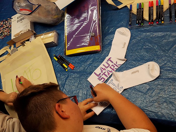 Es wurde gefriemelt, gebastelt, gesprayt und bei bestem Wetter eine LAUTSTARK-Rallye zu verschiedenen Kinderrechten durchgeführt.
